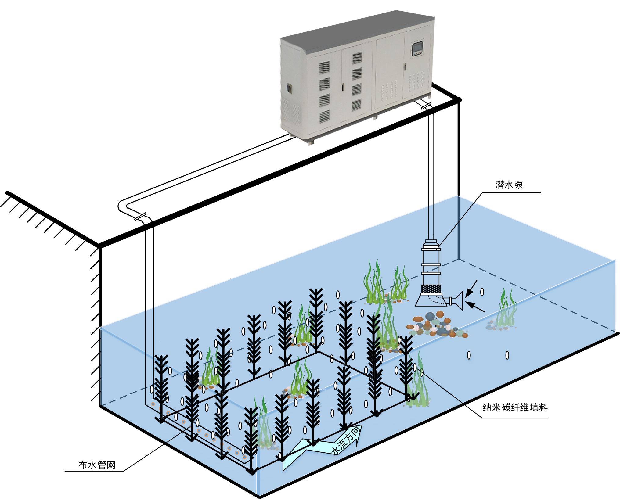 高效富氧濕地產(chǎn)品將純氧設(shè)備與模塊化的潛流濕地相結(jié)合,依靠生物處理技術(shù)聯(lián)用,再生水在進(jìn)入河道前,先經(jīng)過(guò)人工濕地處理,再進(jìn)入推流富氧生物處理技術(shù)系統(tǒng)。進(jìn)入人工濕地的再生水呈波形流動(dòng),使其在垂直方向上多次經(jīng)過(guò)濕地內(nèi)部具有不同處理特性的構(gòu)造層以調(diào)節(jié)再生水在濕地內(nèi)的滯留凈化時(shí)間,從而強(qiáng)化對(duì)河道水質(zhì)的凈化效果。