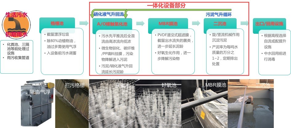 氣升回流一體化污水處理設(shè)備由厭氧-好氧生化法(A/O)反應(yīng)單元,納米碳纖維接觸氧化單元、膜過濾單元組合而成。根據(jù)污水理化與排放標準的不同,對A/O生化反應(yīng)單元,與納米碳纖維接觸氧化單元,膜過濾單元等以單元組合形式進行模塊化、定制化的設(shè)計。通過對各單元運行參數(shù)(如水力停留時間、回流比、污泥濃度等)進行優(yōu)化設(shè)計實現(xiàn)反應(yīng)器的快速啟動,高效運行和水質(zhì)穩(wěn)定達標。設(shè)備具有環(huán)境相容性,可地面式也可地埋式;污泥產(chǎn)量少,污泥處置成本低;沒有污泥回流泵,設(shè)備運行能耗低;采用膜過濾單元,設(shè)備出水水質(zhì)好;設(shè)備緊湊,自動化程度高,便于施工和操作。